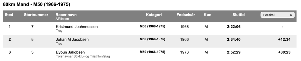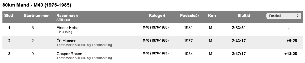Okkara fremstu oyggjaleikaluttakarar eru enn væl fyri, og í opna bólkinum hjá monnum vann Pauli Poulsen, Troy, við tíðini 3:11:00 frammanfyri Kostas Garoflos, Tórshavnar Súkklu- og Triathlonfelag, við 3:16:14 og Bergtór Tórsteinsson, Norðstrok, við 3:19:26.