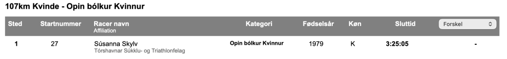 Súsanna Skylv, Tórshavnar Súkklu- og Triathlonfelag, vann opna bólkin hjá kvinnum við tíðini 3:25:05, sum var fjórðbesta tíðin yvirhøvur á longsta teininum hendan dagin! Íalt 10 íðkarar luttóku á longsta teininum.