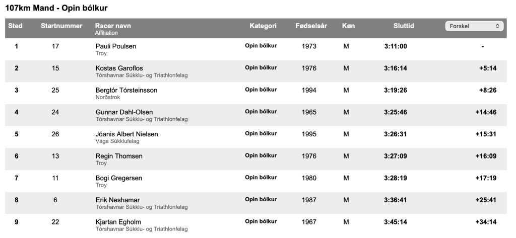 Startur og mál varð við Tjarnir í Hoyvík, og opnu bólkarnir hjá kvinnum og monnum súkklaðu 107 km við umleið 1500 hm. Tey koyrdu leiðina Tjarnir – Svínáir – Saksun – Tjarnir.