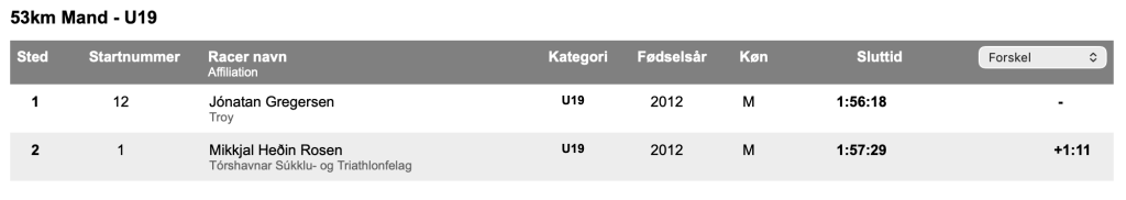 2 U19 unglingar royndu seg á styttsta teininum, Jónatan Gregersen, Troy, vann kappingina við 1:56:18 frammanfyri Mikkjal Heðin Rosen, Tórshavnar Súkklu- og Triathlonfelag, sum hevði tíðina 1:57:29.