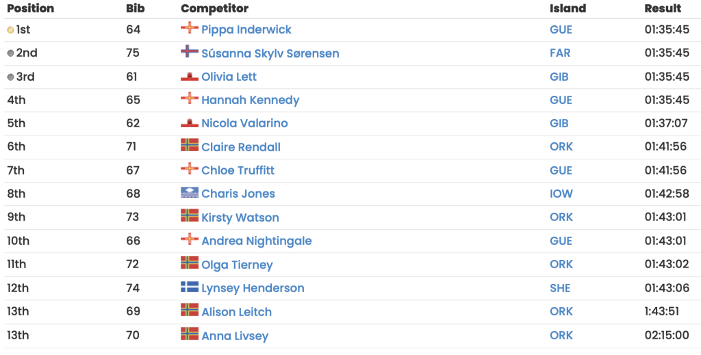 Hon kom á mál beint frammanfyri kappingarneytarnar við tíðini 01:00:24. Silvur og bronsa fóru til Hannah Kennedy og Pippa Inderwick, báðar frá Guernsey, sum komu á mál við tíðini 01:00:26.